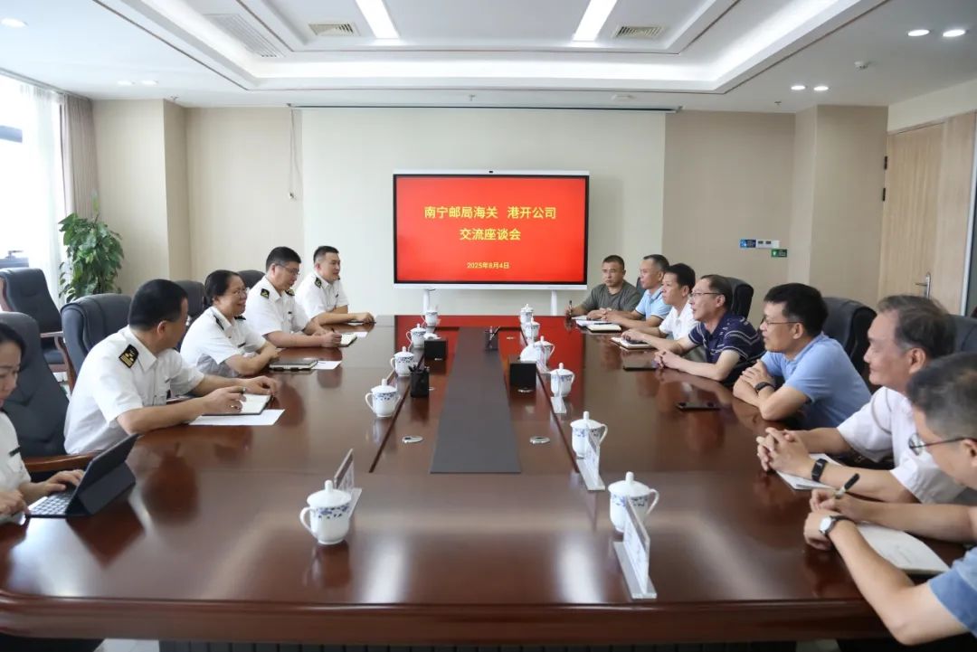 南寧郵局海關(guān)副關(guān)長李良、余泳,南寧交投集團副總經(jīng)理、港開公司副董事長周宏,港開公司副總經(jīng)理藍澄、陳志杰及雙方有關(guān)部門負(fù)責(zé)人參加座談。(港開公司 覃燕春)